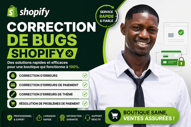 Je propose un service professionnel de correction de bugs Shopify, résolution d’erreurs de paiement Shopify, réparation de thèmes Shopify, optimisation du panier, checkout et amélioration des performances de votre boutique. Que ce soit un bug après une mise à jour, une application qui crée des conflits ou un problème de code Liquid, je peux intervenir rapidement.