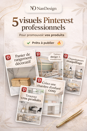 Vous recevez 5 visuels Pinterest professionnels prêts à publier.