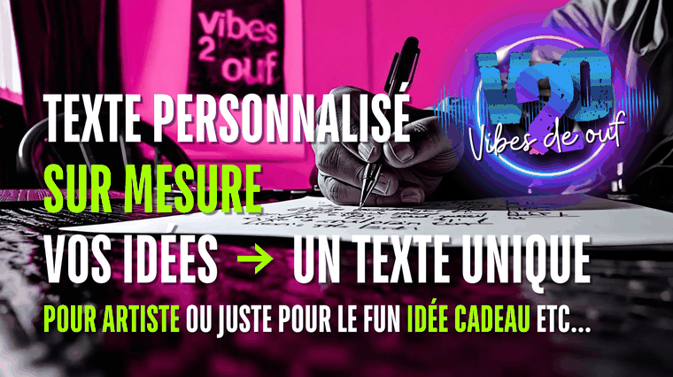 Auteur passionné, je crée des textes et des chansons entièrement personnalisés, pensés spécialement pour vous et votre histoire. ✍️ Service 1 : Textes sur mesure (pour artistes & particuliers) J’écris moi-même des textes originaux pour les artistes comme pour les particuliers : paroles de chanson, messages créatifs ou textes personnels. Je m’appuie sur les éléments que vous me fournissez : événement, émotions, anecdotes, personnes concernées, ton souhaité (fun, émouvant, romantique, décalé…), message à transmettre, etc. 🎧 Service 2 : Chansons personnalisées J’écris le texte sur mesure, puis je le mets en musique à l’aide d’outils numériques et d’intelligence artificielle afin de donner vie à une chanson unique, adaptée au style musical de votre choix (pop, rap, électro, variété, chill, festive, etc.). Vous pouvez également me fournir une musique de référence pour m’inspirer. 💡 Ces services sont idéals pour : Anniversaire Déclaration d’amour Surprise ou cadeau original Événement spécial Projet artistique ou chanson fun entre amis 👉 Chaque projet est personnel et sur mesure : vous me donnez un maximum de détails, je m’occupe du reste. 🔁 Des ajustements peuvent être proposés selon l’offre choisie, afin que le résultat final corresponde parfaitement à vos attentes. 🎶 Texte ou chanson : offrez (ou offrez-vous) une création unique qui ne ressemble à aucune autre. Retrouvez-moi sur YouTube: https://youtube.com/@vibes2ouf?si=uRqZlFELSnwWO5Gi Tiktok : https://www.tiktok.com/@vibes2ouf?_r=1&_t=ZN-933NLCwN4BW