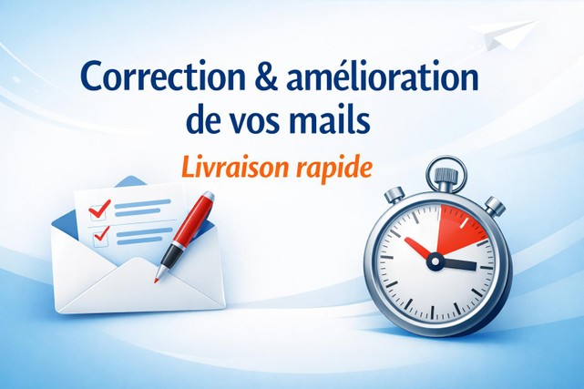 bonjour, Je suis spécialisé dans la correction et la reformulation d’emails professionnels. Je transforme vos messages pour qu’ils soient clairs, polis et efficaces, parfaits pour relances clients, messages administratifs ou communications importantes. Rapide, précis et à l’écoute de vos besoins, je vous aide à envoyer vos emails en toute confiance.