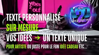 Auteur passionné, je crée des textes et des chansons entièrement personnalisés, pensés spécialement pour vous et votre histoire. ✍️ Service 1 : Textes sur mesure (pour artistes & particuliers) J’écris moi-même des textes originaux pour les artistes comme pour les particuliers : paroles de chanson, messages créatifs ou textes personnels. Je m’appuie sur les éléments que vous me fournissez : événement, émotions, anecdotes, personnes concernées, ton souhaité (fun, émouvant, romantique, décalé…), message à transmettre, etc. 🎧 Service 2 : Chansons personnalisées J’écris le texte sur mesure, puis je le mets en musique à l’aide d’outils numériques et d’intelligence artificielle afin de donner vie à une chanson unique, adaptée au style musical de votre choix (pop, rap, électro, variété, chill, festive, etc.). Vous pouvez également me fournir une musique de référence pour m’inspirer. 💡 Ces services sont idéals pour : Anniversaire Déclaration d’amour Surprise ou cadeau original Événement spécial Projet artistique ou chanson fun entre amis 👉 Chaque projet est personnel et sur mesure : vous me donnez un maximum de détails, je m’occupe du reste. 🔁 Des ajustements peuvent être proposés selon l’offre choisie, afin que le résultat final corresponde parfaitement à vos attentes. 🎶 Texte ou chanson : offrez (ou offrez-vous) une création unique qui ne ressemble à aucune autre. Retrouvez-moi sur YouTube: https://youtube.com/@vibes2ouf?si=uRqZlFELSnwWO5Gi Tiktok : https://www.tiktok.com/@vibes2ouf?_r=1&_t=ZN-933NLCwN4BW
