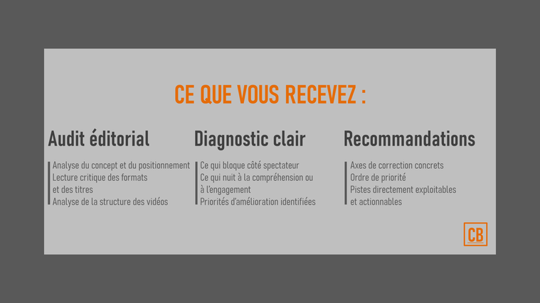 Mon rôle est d’analyser votre chaîne avec un regard extérieur, éditorial et stratégique, pour comprendre ce qui freine la compréhension, l’engagement ou le watchtime côté spectateur.