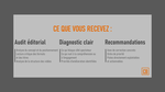L’option d’audit approfondi propose un travail plus dense et plus stratégique, avec une analyse élargie des formats, des angles et de la cohérence globale du projet. Le livrable est plus détaillé et inclut des pistes concrètes d’évolution ainsi qu’une logique de priorisation dans le temps.