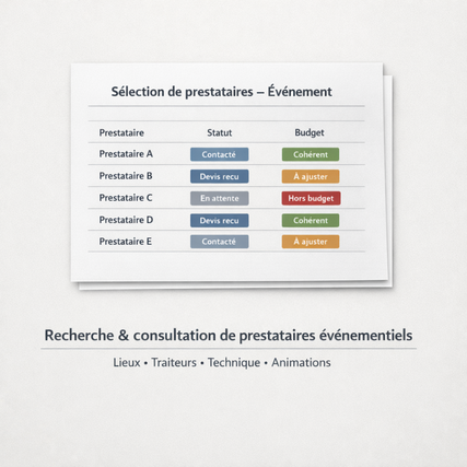 Je vous accompagne dans cette phase 1 essentielle en recherchant, contactant et consultant des prestataires adaptés à votre futur événement, afin que vous puissiez comparer des devis clairs et prendre vos décisions en toute confiance.