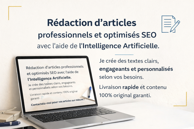 Je suis expert en rédaction avec l’aide de l’intelligence artificielle. Je propose des articles de qualité, adaptés à votre sujet et à votre audience. Vous recevrez un texte prêt à publier, structuré et sans faute d’orthographe. Je peux également adapter le style selon votre besoin : formel, informatif ou marketing
