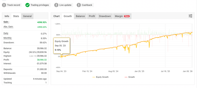 Durant cette période, il a généré plus de +880% de bénéfices, avec une gestion optimisée du risque et une stabilité constante, même lors des phases de forte volatilité du marché.