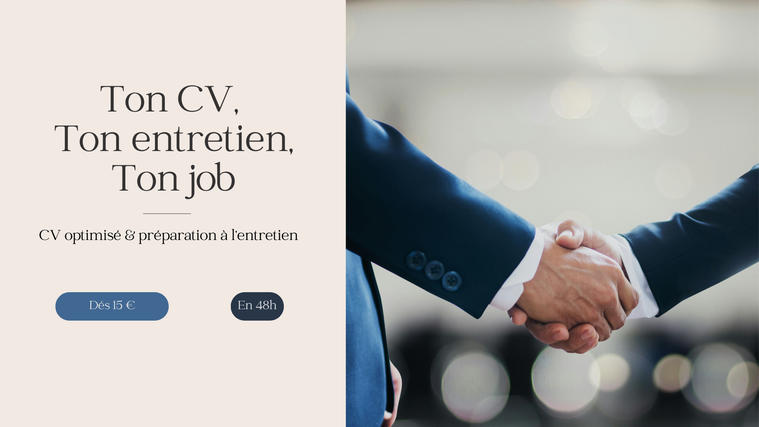 Vous envoyez des candidatures sans retour ? Dans la majorité des cas, ce n’est pas votre expérience, mais la façon dont elle est présentée. R.H avec 5 ans d’expérience en recrutement, je retravaille votre CV comme un recruteur : rapidement, de façon factuelle, avec des critères précis. CV final prêt à envoyer (Format Word et PDF) Mais aussi si : Vous hésitez à postuler ? Vous ne savez pas si votre profil correspond vraiment à l’offre ? Je vous aide à comprendre l’offre comme un recruteur et à vous positionner efficacement avec un décryptage de l'offre et une préparation à l'entretien. Je ne promets pas un emploi, mais un CV clair, crédible et aligné avec les attentes recruteurs. N'attendez plus pour donner un nouvel élan à votre carrière. Contactez moi dès aujourd'hui pour discuter de vos besoins et découvrir comment je peux vous aider à atteindre vos objectifs professionnels !