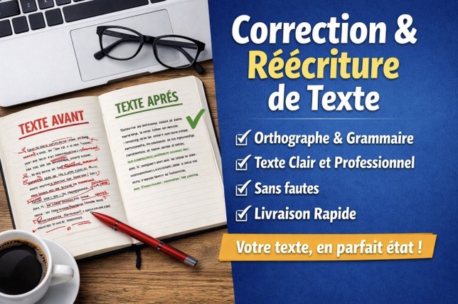 Vous avez un texte mais il contient des fautes ou manque de clarté ? 📝 Je vous propose une correction complète et une réécriture professionnelle pour un rendu fluide et naturel. ✏️ ✔ Orthographe et grammaire ✔ Réécriture claire et professionnelle ✔ Respect du sens original ✔ Livraison rapide Envoyez-moi votre texte, votre CV ou lettre de motivation et je m’en occupe.