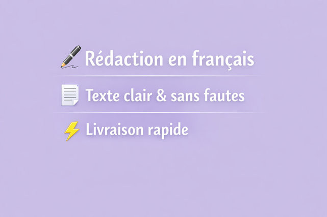 Je vous propose un service de rédaction en français, clair, fluide et sans fautes, adapté à vos besoins.
