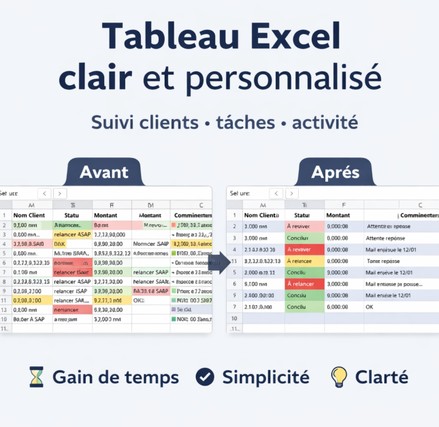 Vous avez besoin d’un tableau clair pour suivre votre activité, mais Excel vous fait perdre du temps ? Je crée pour vous un tableau Excel simple, lisible et personnalisé, adapté à votre besoin réel (clients, tâches, ventes, suivi…). Ce que vous obtenez • ✔️ 1 tableau Excel clair et structuré • ✔️ Colonnes utiles (statut, dates, totaux, commentaires…) • ✔️ Formules simples et fiables (sans complexité inutile) • ✔️ Mise en forme lisible • ✔️ Explication pour être autonome Idéal pour • Indépendants / auto-entrepreneurs • Petites entreprises • Gestion de clients, tâches, ventes, suivi administratif Comment ça se passe 1. Vous m’expliquez votre besoin 2. Je crée le tableau adapté 3. Je vous livre un fichier prêt à l’emploi