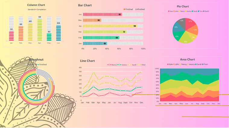- Jusqu’à 4 graphiques Excel (barres, courbes ou secteurs)