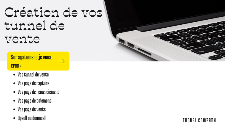 Tunnel Company est un service spécialisé dans la conception, le design, le copywriting et l’automatisation de tunnels de vente sur Systeme.io, basé sur 5 années d’expérience terrain dans le marketing digital et la vente en ligne.