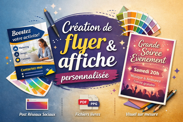 Vous avez besoin d’un flyer ou d’un visuel simple et efficace pour votre projet, votre événement ou vos réseaux sociaux ? Je vous propose la création d’un visuel personnalisé (flyer, affiche ou post pour réseaux sociaux) réalisé avec soin, selon vos besoins et votre style. 🔹 Ce que vous obtenez : – 1 visuel 100 % personnalisé – Format au choix (A4, carré, story, post Instagram, etc.) – 1 à 2 retouches incluses – Fichier livré en PNG / JPG (et PDF si besoin) Il vous suffit de m’envoyer votre texte, vos couleurs ou inspirations, et je m’occupe du reste. N’hésitez pas à me contacter avant commande si vous avez une question 😊