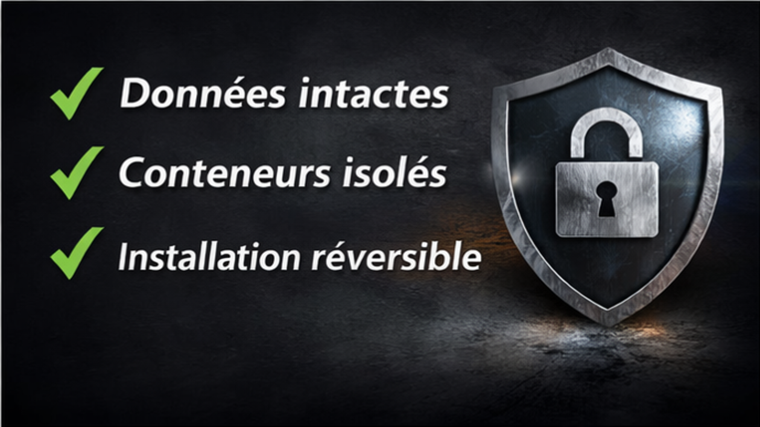 Tout est isolé dans des conteneurs Docker, **réversible** et sans impact sur ce qui fonctionne déjà.