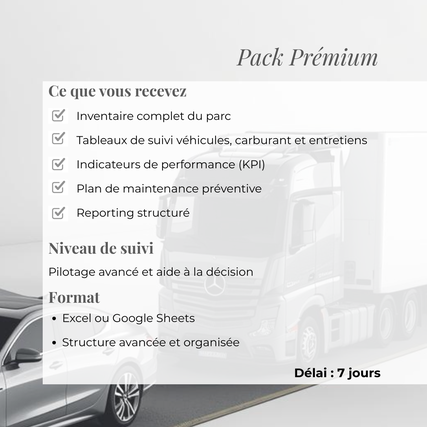 Avec ce pack Premium, je vous aide à passer d’une gestion opérationnelle à une gestion stratégique du parc de véhicules, basée sur l’analyse, l’anticipation et la performance.