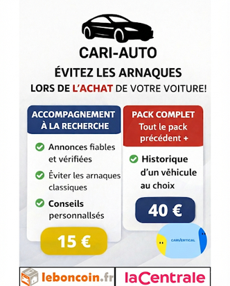 Tu veux acheter une voiture mais tu as peur de te faire arnaquer ? Je t’aide à trouver des annonces fiables, éviter les pièges et choisir un véhicule adapté à ton budget sur des sites tel que Leboncoin, la centrale et Facebook: Analyse d’annonces Éviter les arnaques Conseils personnalisés À partir de 14,99€ et 39,99 avec l'historique du véhicule par CarVerticale
