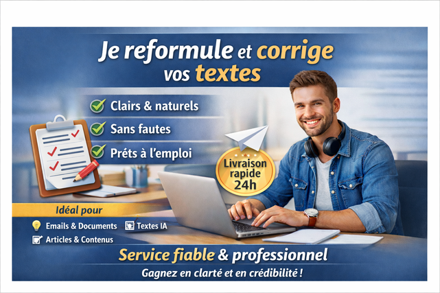 Je reformule, corrige et améliore vos textes pour qu’ils soient clairs, fluides et agréables à lire. Idéal pour : – emails – descriptions – textes générés par IA Travail rapide, français naturel, livraison soignée.
