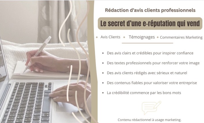 Je rédige des avis clients professionnels et naturels pour aider les entreprises à renforcer leur crédibilité, rassurer leurs prospects et valoriser leurs services grâce à des contenus marketing clairs et efficaces.