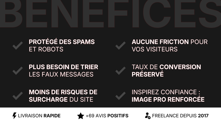 Je vous propose d'installer les meilleures technologies actuelles comme ReCaptcha, Hcaptcha ou Cloudflare Turnstile pour bloquer définitivement les robots tout en laissant passer vos clients en toute fluidité.