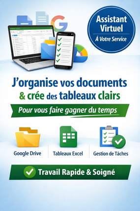 Vous perdez du temps avec des documents mal organisés ou des tableaux confus ? Je vous aide à structurer vos fichiers et tâches pour plus de clarté et de productivité. ✅ Ce que je peux faire pour vous : Organisation de vos fichiers sur Google Drive Mise en forme professionnelle de documents (Google Docs) Création de tableaux simples et clairs sur Google Sheets Aide à l’organisation de tâches et plannings Organisation basique de contenu pour réseaux sociaux. ✔ Pourquoi me choisir ? Travail sérieux et confidentiel Communication rapide Respect strict des délais 🎯 Idéal pour entrepreneurs, étudiants et particuliers débordés.