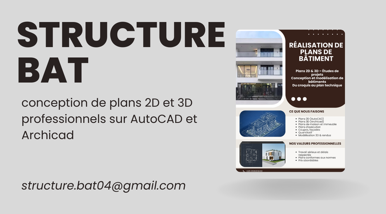 STRUCTURE-BAT est spécialisé dans la réalisation de plans architecturaux 2D et 3D à l’aide des logiciels AutoCAD et Archicad. Nous accompagnons particuliers, professionnels et étudiants dans la conception de plans clairs, précis et exploitables, adaptés aux projets de construction, d’étude et de présentation. Notre approche repose sur la rigueur technique, le respect des délais et une communication claire afin de garantir des livrables professionnels conformes aux attentes du client.