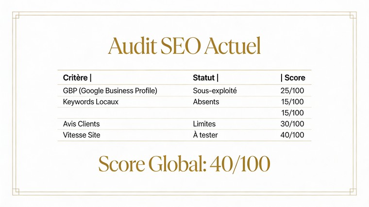 Mon analyse ne se contente pas de survoler votre site ; elle plonge au cœur de votre écosystème local pour identifier les freins à votre croissance :