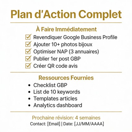 À l'issue de cet audit, vous recevrez un rapport PDF détaillé classant les 10 optimisations prioritaires par impact. Nous identifierons ensemble l'action n°1 à lancer immédiatement pour apparaître dans le précieux "Top 3 Local" de Google.