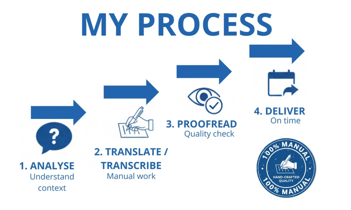 Ce que je vous propose pour 5,85 $US : Pour l'offre de base, je réalise la traduction ou la transcription de votre document/audio jusqu'à 100 mots ou 2 minutes.