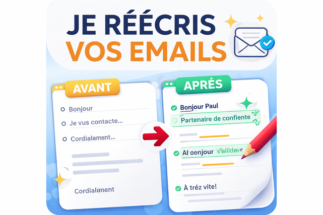 Je relis, réécris et optimise vos emails professionnels (prise de contact, relance, réponse client), en améliorant :
