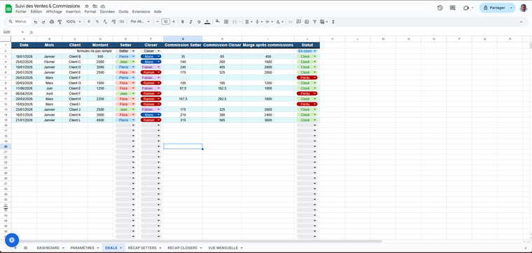 Je vais créer un tableau Google Sheets de suivi des ventes et commissions (setters/closers)