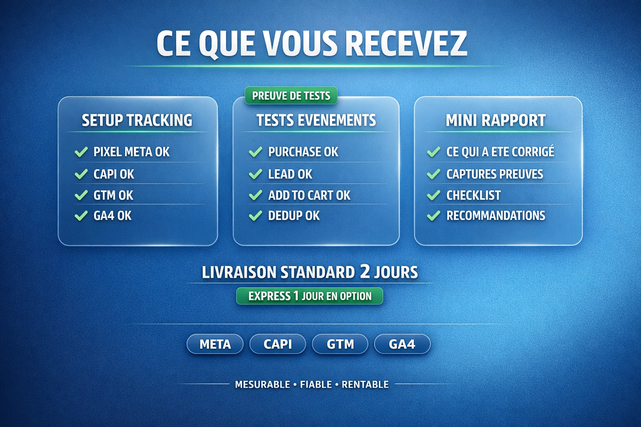 commande l offre de base si tu veux un pixel meta et capi fonctionnels avec tests et preuves. si tu as un ecommerce complet plusieurs domaines plusieurs pixels ou un besoin serveur avancé choisis les options. avant de commander envoie moi ton cms shopify wordpress prestashop ou autre ton objectif achat ou lead et si tu as deja gtm et ga4