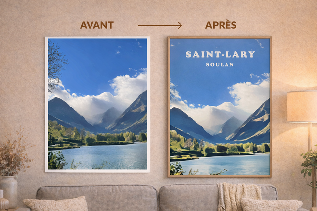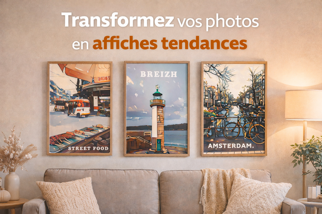 Je transforme vos photos en affiches tendances, prêtes à être imprimées ou utilisées en version digitale.