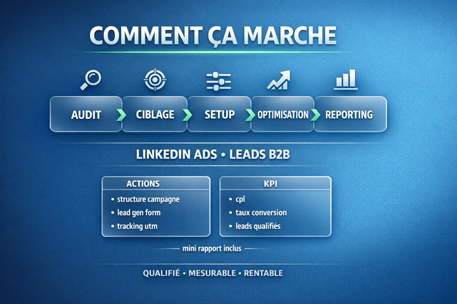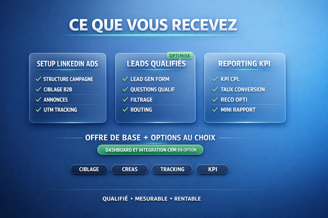 commande l offre de base si tu veux lancer ou remettre au propre une campagne linkedin ads b2b. si tu veux plusieurs campagnes lead gen forms tracking avance dashboard ou integration crm choisis les options. avant de commander envoie ton objectif ton offre ton pays cible et ton budget pub
