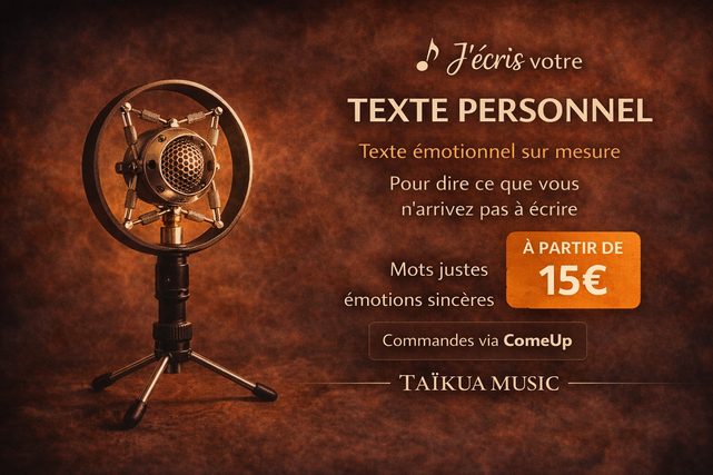 🌙 TAÏKUA MUSIC Des mots qui portent. Une plume qui révèle. Je suis Taïkua Music, autrice et créatrice de textes émotionnels. J’écris pour celles et ceux qui souhaitent exprimer une histoire, une émotion ou un message avec sincérité, profondeur et sens. Mon univers repose sur la force, la résilience, la reconstruction et toutes ces choses que l’on vit souvent en silence. Je transforme une idée, un sentiment ou un vécu en un texte authentique et percutant. Mon style d’écriture est : ✨ direct ✨ sensible ✨ poétique sans être compliqué ✨ profondément humain Je propose : 🎵 des paroles de chanson sur mesure 🖤 des textes émotionnels personnalisés 🔥 des créations inspirées d’un vécu, d’un thème ou d’une ambiance précise Chaque texte est travaillé avec attention, livré avec sérieux et conçu pour transmettre une émotion vraie et juste. 📌 Des extraits de mon univers artistique sont visibles dans mon portfolio ComeUp, et les liens vers mes réseaux sociaux sont également disponibles sur mon profil pour celles et ceux qui souhaitent découvrir d'avantage mon travail. ✨ Bienvenue dans l’univers Taïkua Music. ✨ Je suis prête à donner du sens aux mots qui vous représentent.