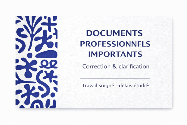Je propose des prestations ponctuelles de relecture, correction et amélioration de documents professionnels ou institutionnels déjà existants. Selon le document, la prestation peut inclure : – la correction de l’orthographe, de la grammaire et de la syntaxe – l’amélioration de la clarté, de la fluidité et de la lisibilité – une réécriture légère de textes existants (sans création de contenu) – la mise en forme : titres, styles, hiérarchisation, pagination, sommaire Documents concernés : rapports, dossiers, présentations, notes, CV, documents de candidature, textes traduits en français. L’intervention se fait au forfait, après lecture du document. Le travail est soigné, le contenu initial est respecté et la confidentialité est garantie. Exemple d’offre : 🎯 Offre de base – 60 € Relecture, correction et mise en forme d’un document jusqu’à 5 pages. Un devis peut également être proposé après consultation du document et des prestations souhaitées.