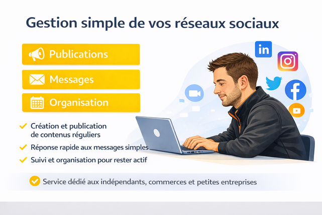J’aide les indépendants et les commerces à gérer des tâches simples mais essentielles : – publications sur les réseaux sociaux – réponses aux messages – organisation et suivi Ma façon de travailler Je privilégie une approche simple, claire et efficace. Si vous manquez de temps ou que vous ne savez pas exactement quoi déléguer, je vous aide à y voir plus clair et à avancer sans complication inutile. Objectif : vous faire gagner du temps avec un service régulier, fiable et facile à mettre en place.