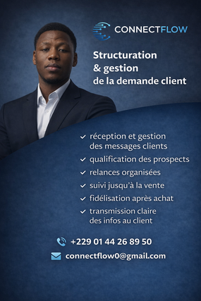Je suis spécialiste de la gestion et optimisation des flux clients. J’aide les entreprises, commerces et entrepreneurs à ne plus perdre de clients en prenant en charge la gestion de leurs messages (WhatsApp, réseaux sociaux) et le suivi des prospects. Grâce à une approche structurée inspirée de la logistique, j’organise chaque demande client, j’assure des réponses professionnelles, des relances efficaces et un suivi clair jusqu’à la conversion. Mon objectif : transformer chaque message reçu en opportunité réelle, tout en faisant gagner du temps et de la sérénité au dirigeant. Sérieux, réactif et orienté résultats, je travaille comme un partenaire business, pas comme un simple exécutant.