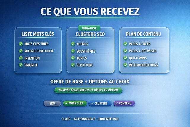 commande l offre de base si tu veux une strategie de mots cles claire avec clusters et plan de contenu. si tu veux analyse concurrents briefs redaction optimisation on page ou suivi dashboard choisis les options. avant de commander envoie ton site ta niche ton pays et ton objectif