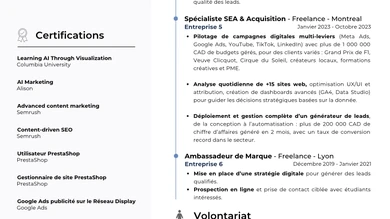 Consultant en marketing digital avec une forte expertise en SEO, stratégie de contenu et acquisition en ligne, j’accompagne les entreprises, cabinets et organisations dans le développement de leur visibilité digitale et la performance de leurs supports web. Mon approche combine vision stratégique et exécution opérationnelle : audit de sites web, optimisation SEO (technique, sémantique et éditoriale), structuration de parcours utilisateurs, création de contenus à forte valeur ajoutée (articles, pages web, dossiers thématiques), et analyse des performances. L’objectif n’est pas seulement de générer du trafic, mais de capter une audience qualifiée et de transformer la visibilité en levier business durable. J’ai travaillé aussi bien en agence qu’en collaboration directe avec des entreprises, sur des projets B2B et B2C, en France et à l’international. Cette diversité m’a permis de m’adapter à des environnements exigeants, avec des contraintes métiers fortes, et de proposer des solutions pragmatiques, mesurables et alignées avec les enjeux réels des organisations. À l’aise en travail remote, autonome et structuré, j’interviens aussi bien en renfort ponctuel qu’en accompagnement récurrent, pour aider mes clients à clarifier leur positionnement, améliorer leur présence en ligne et produire des contenus cohérents, utiles et performants sur le long terme.