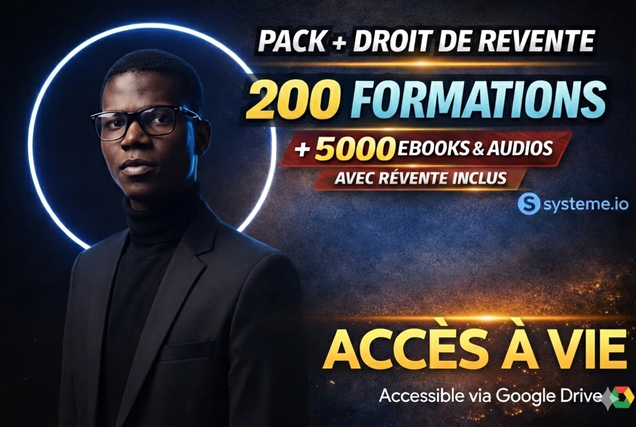 Je vous propose un pack digital clé en main, prêt à l’emploi, regroupant 200 formations complètes en vidéo et 5 000 livres PDF & audios, accessibles à tout moment sur téléphone ou ordinateur. Ce pack vous permet :