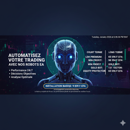 * **PACK ACCOMPAGNEMENT (Dès 196 787 F CFA) :** Obtenez le Robot **EURUSD** ou **BTC** avec une semaine de suivi personnalisé (conseils et contrôle de performance inclus).