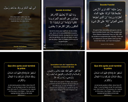 Contenu Authentique : Versets du Coran ou Duaas avec le texte arabe et la traduction.