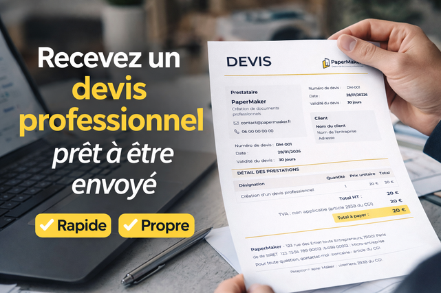 L’offre de base comprend la création d’un devis professionnel clair et prêt à être envoyé.