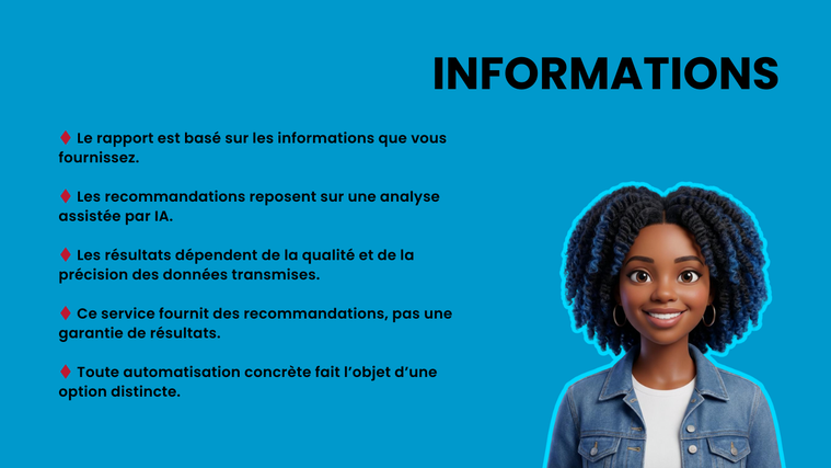 ◆ La qualité de l'analyse dépend directement des informations que vous me transmettez. Plus elles sont complètes, plus les recommandations seront pertinentes.