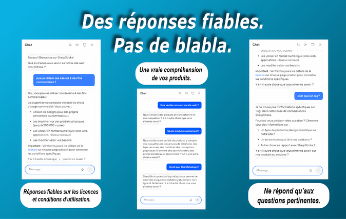 1- DES RÉPONSES FIABLES ET COHÉRENTES Votre assistant répond uniquement à partir de vos contenus (documents, site, ressources internes). Pas d’invention, pas de réponses approximatives. C'est la garantie du "Zéro Hallucination".
