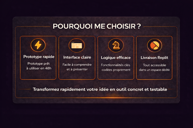Le prototype est développé via Replit, avec une logique claire et une interface simple, afin de livrer une solution utilisable, compréhensible et exploitable dès la première version.