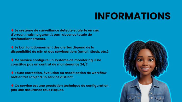 ◆ Aucune garantie de performance ou de disponibilité continue n'est fournie. Ce service configure un système de monitoring, il ne constitue pas un contrat de maintenance avec intervention humaine 24/7.