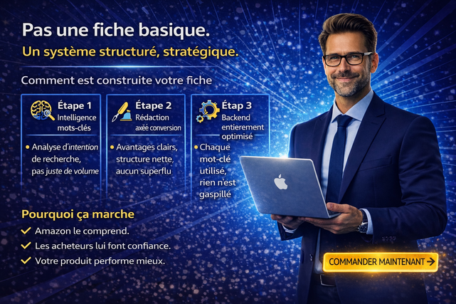 Je crée ou optimise des listings Amazon avec une approche structurée et professionnelle, axée sur la conversion, le référencement et la conformité aux règles Amazon.