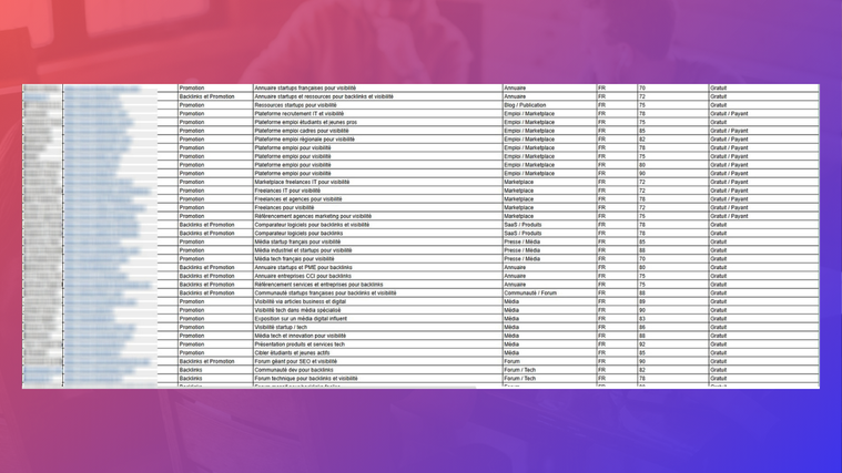 👉 Je vous propose un fichier Excel prêt à l’emploi, regroupant 1 500 sites sur lesquels vous pouvez tenter de créer des backlinks, afin de poser rapidement les bases de votre stratégie SEO.