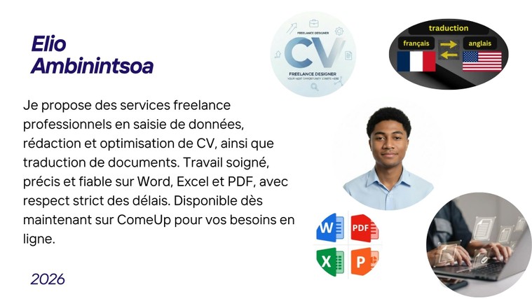 Bonjour ! 👋 Je suis Elio, spécialiste en saisie de données, rédaction professionnelle, construction de CV et traduction. Je propose un service rapide, précis et soigné pour vos documents sur Word, Excel, PDF, ainsi que la rédaction et traduction de vos CV ou lettres de motivation. Disponible immédiatement, je m’adapte à vos besoins pour que vos documents soient professionnels, lisibles et attractifs pour vos clients ou recruteurs.